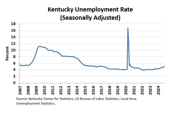 FRANKFORT, Ky. — Kentucky’s seasonally adjusted preliminary October 2024 unemployment rate was 5%, according to the Kentucky Center for Statistics (KYSTATS), an agency within the Kentucky Education and Labor Cabinet.